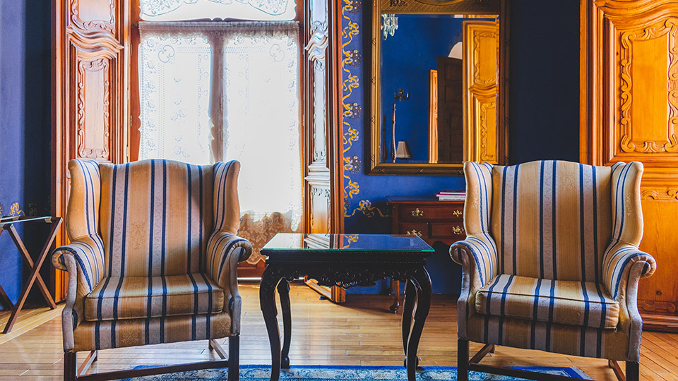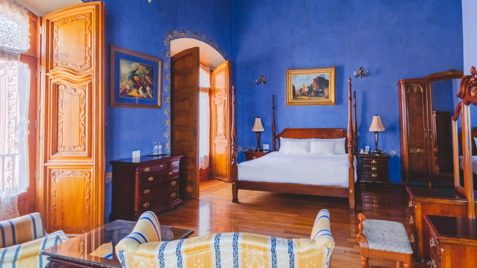 La Suite Doña Trini honra la memoria de las damas queretanas con carácter indomable. Un espacio donde el azul intenso y los detalles virreinales reflejan la elegancia sobria y la firmeza de espíritu de quienes escribieron la verdadera historia entre estos muros.