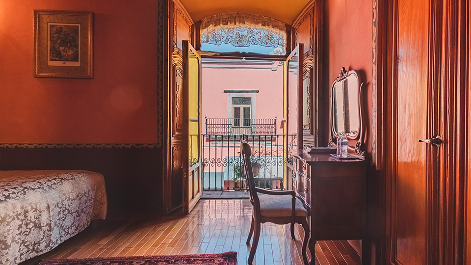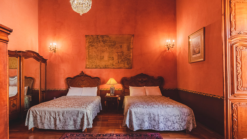 La Suite Maximiliano y Carlota, un homenaje a la realeza trágica, te envuelve en tonos carmesí y elegante mobiliario de época. Con un balcón con vistas al centro Histórico de Querétaro.